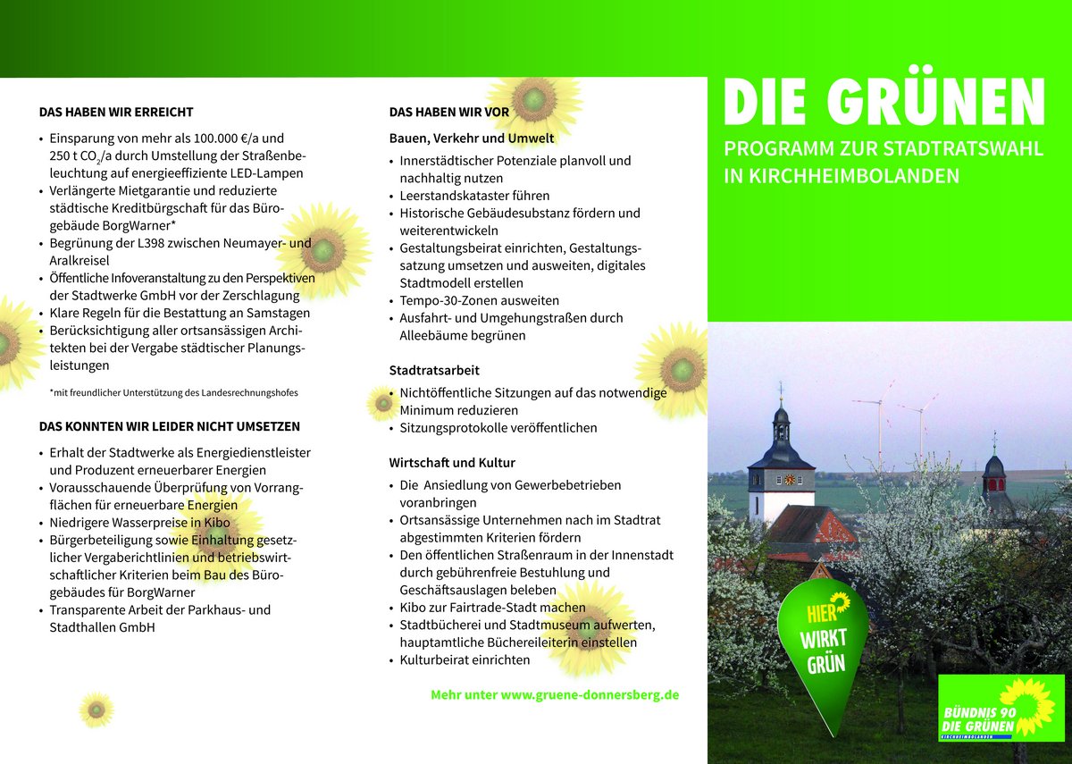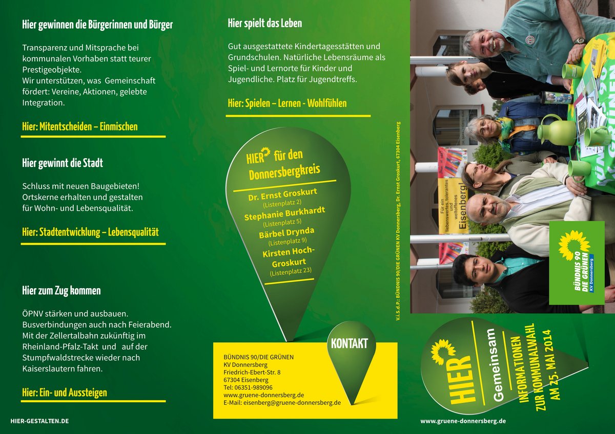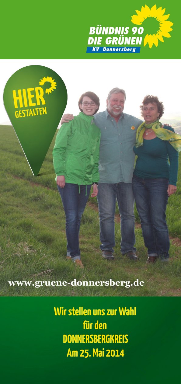Vierzig KandidatInnen bewerben sich bei der Wahl am 25. Mai 2014 für Bündnis 90/Die Grünen um einen Sitz im Kreistag. Rita Beck (VG Winnweiler) und Lisett Stuppy (VG Göllheim) stehen dabei auf den Plätzen 1 und 3 zur Wahl. Neu dabei ist Ernst Groskurt, Fraktionvorsitzender der Grünen im VG-Rat in Eisenberg. Er wurde mit Platz 2 auf einen aussichtsreichen Listenplatz für die Wahl nominiert. Der Kreisverband Donnersberg baut darauf, sein Ergebnis 2009 von drei Sitzen im Kreistag bei der anstehenden Wahl 2014 verbessern zu können.